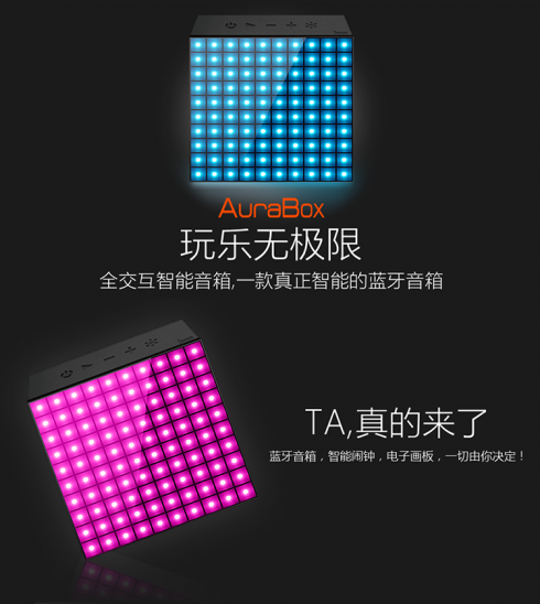 首先是“胸大”和“颜值高”,这是基本属性,标配,虽然不排除这世界有部分人喜欢罗玉凤式的知性,但绝大多人还是视觉动物,讲究的是长得漂亮身材好——所以AuraBox智能蓝牙音箱肯定能让你满足,它脸上自带一个超大的LED显示屏,能通过配套的APP进行控制,你可以让它显示时间,也可以让它展示自己设计的图案,还可以像音响的电平指示器一样,让它随着节奏自动变换色彩。